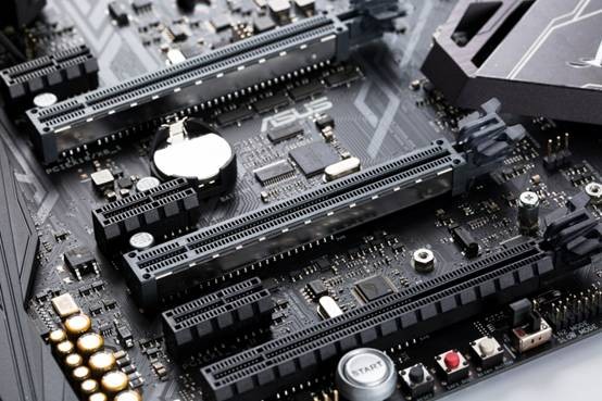 做工精致的散热片让整个主板的颜值增色不少。显卡插槽上的金属装甲尤其惹眼,那是华硕独家的Safeslote技术,可以大大增强显卡插槽的坚固程度,在立式机箱中使用超重显卡也不会有压力。