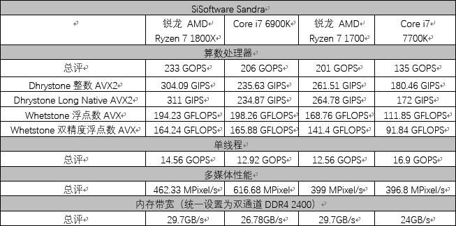 多媒体运算方面,Core i7 6900K优势比较明显,而锐龙 AMD Ryzen 7 1700则和Core i7 7700K基本战平。内存带宽方面,两款锐龙 AMD Ryzen 7的表现一样,都相对同为双通道DDR4的Core i7 7700K有明显优势,Core i7 6900K在双通道模式下也不是锐龙 AMD Ryzen 7的对手,但开启4通道后的情况就不一样了。
