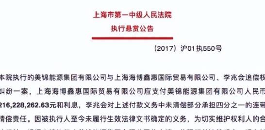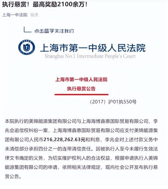 山西前首富李兆会被上海法院悬赏,举报者最高可获2100万元赏金