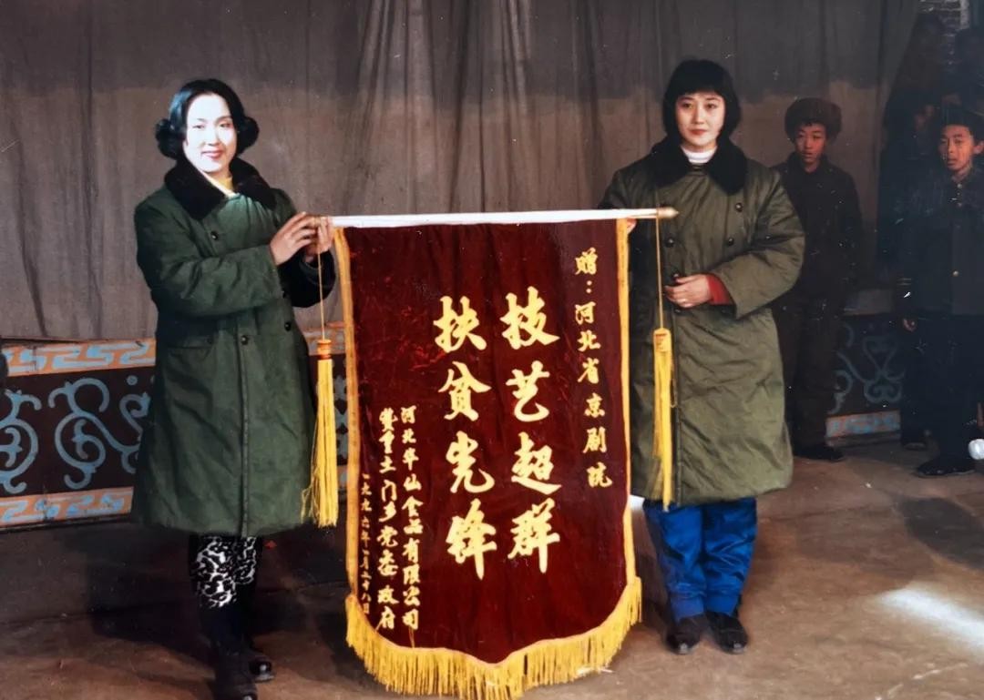 (1996年,随河北省京剧院“送戏下乡”演出受到基层欢迎,张慧芳(右)代表演出人员接受致谢锦旗)