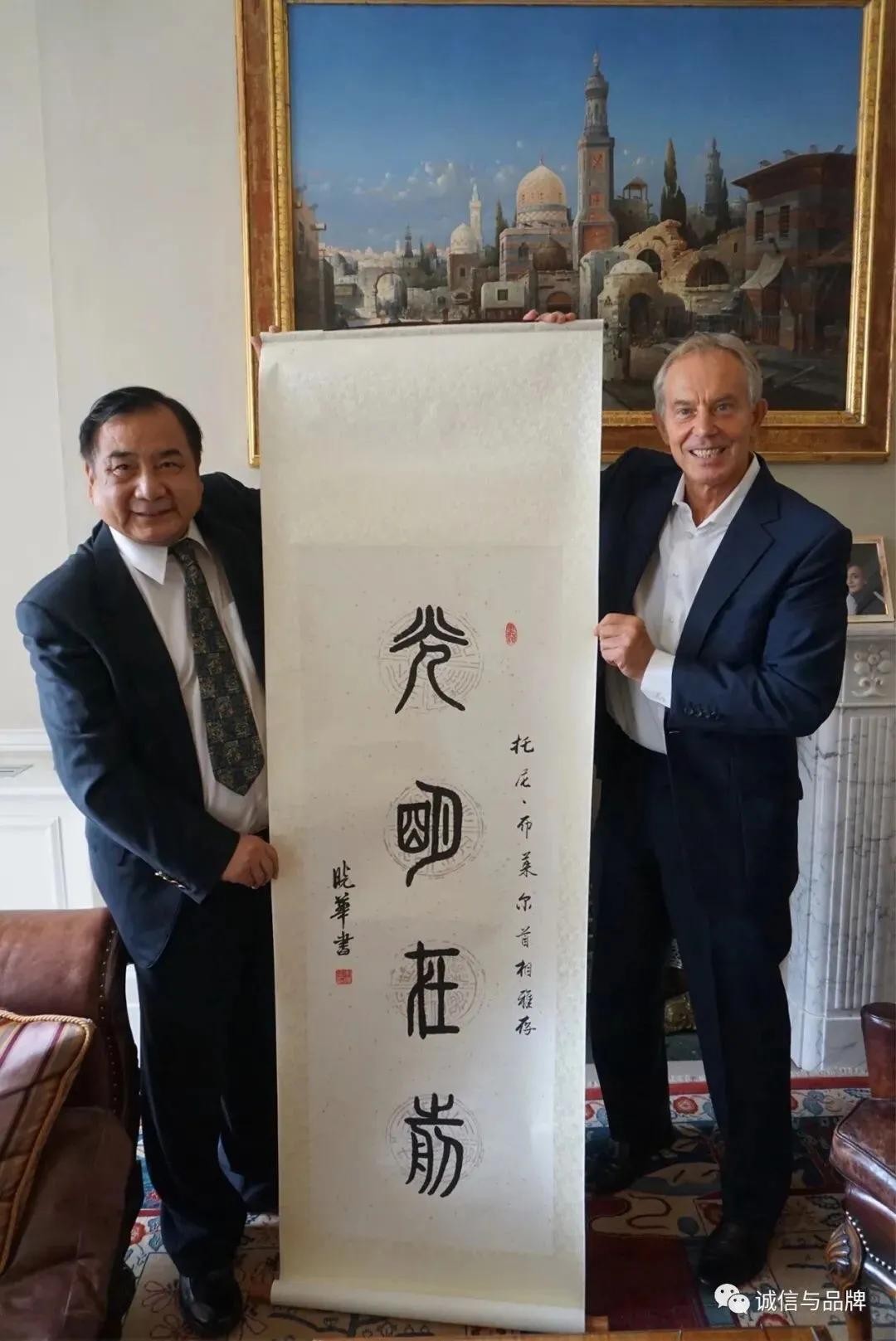 上图:李晓华(左)的书法艺术作品被美、英、法、日、澳……多国元首视为珍品收藏。英国前首相布莱尔(右)在英国伦敦展示李晓华的书法作品。