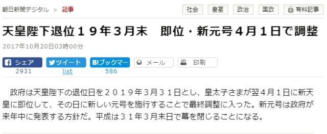 据日本朝日新闻报道,日本现任天皇将于2019年3月31日退位,而德仁皇太子也将于2019年4月1日即位下任天皇。
