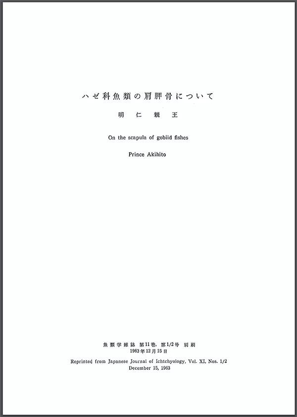 明仁与虾虎鱼的结缘,还得追溯到他还是皇太子的时候。早在1963年,当时的皇太子明仁就在《日本鱼类学杂志》上发表了自己的第一篇学术论文《关于虾虎鱼类肩胛骨的研究》。为了写这篇论文,明仁搜集了67种虾虎鱼类的标本,并对它们各自肩胛骨的形态做了深入的研究和记录。