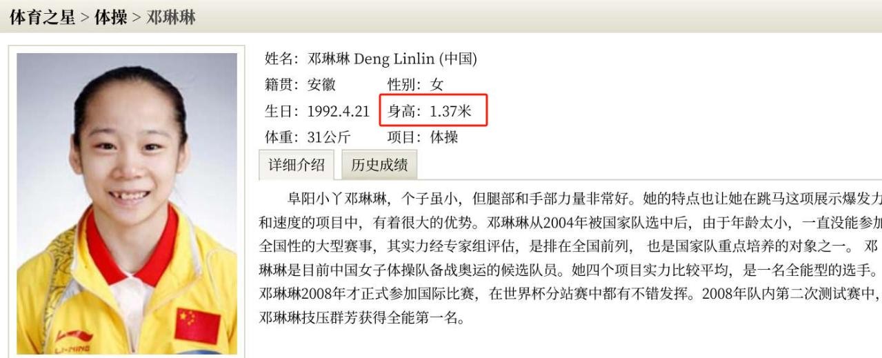 可能是由于专业体操器材比较特殊,再加上各方面心理压力比较大,运动员需要控制饮食等原因,所以,邓琳琳各方面都像小孩子,身高很长一段时间也处在1米37这个高度。