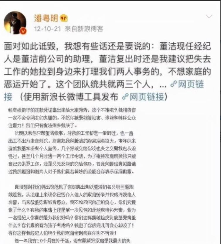 这期间,潘粤明也曾为自己辩解过,奈何董洁白月光和受害者的形象太过深入人心,在舆论的裹挟下,潘粤明的声音很快便被在浪潮中。