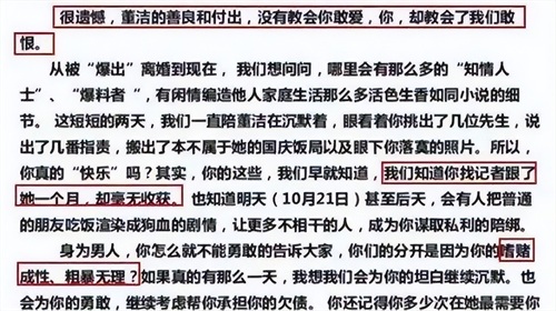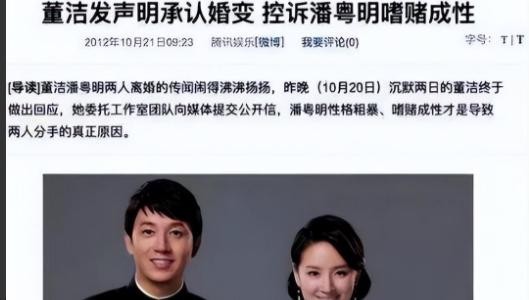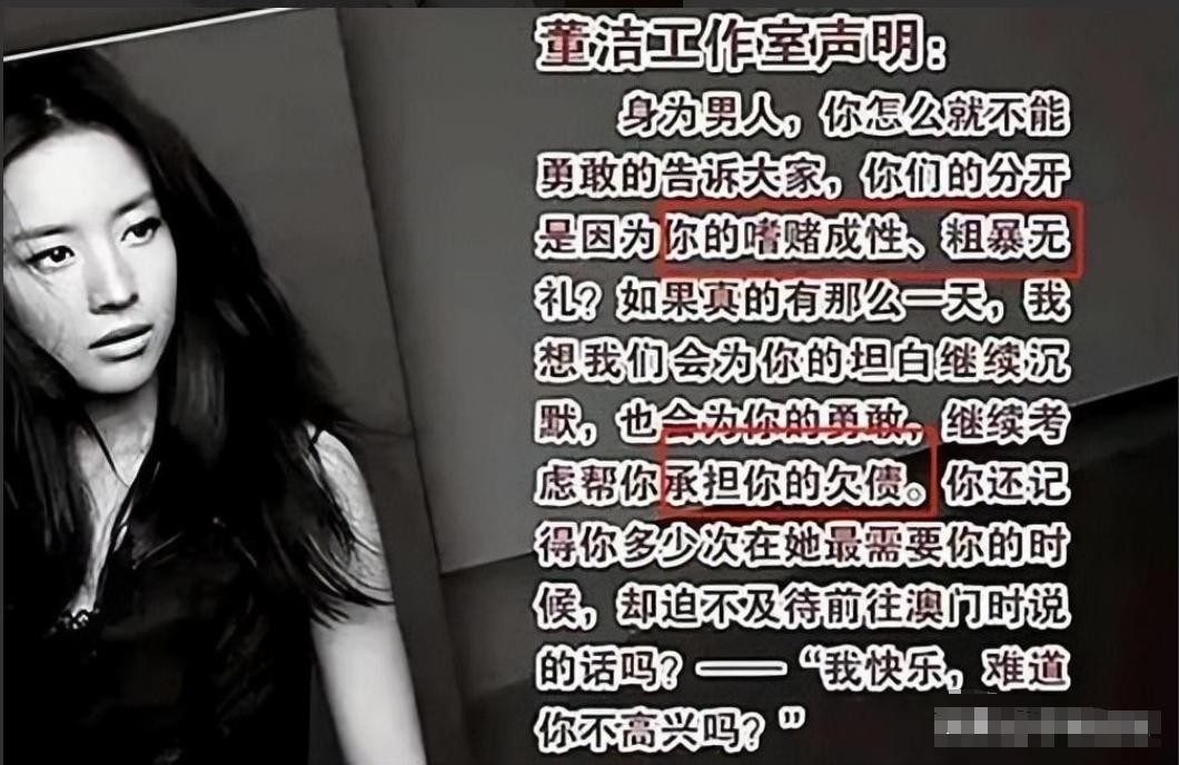 在董洁委托工作室向媒体提交公开信中,董洁将婚姻破灭的缘由全权归咎于潘粤明,一口咬定,是潘粤明性格粗暴、嗜赌成性,才导致这桩婚姻走到了尽头。
