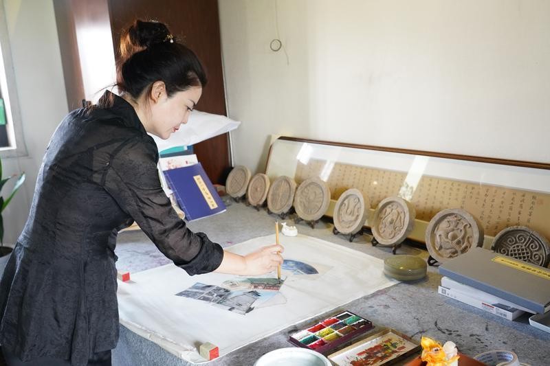 “你们看,这块砖是西汉时期的万字文砖,也是创作锦灰堆的重要元素。我需要找一个合适的构图位置,把它放在纸下边,然后将白芨泡好的中药水喷在上面,万字文的图案就会很神奇地显现出来。之后,用排刷刷出画与砖之间的空气,再用拓包蘸取颜料用力、均匀地把文物的纹路拓在画上。”封晶展示着锦灰堆创作的流程之一。
