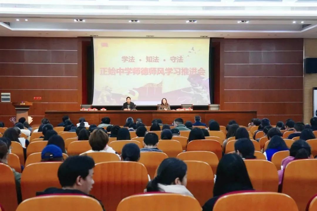 学校举行师德师风推进会,进一步压实师德师风建设责任。现场发放了由褚雁平书记主持编制的《教育法律法规制度汇编》。