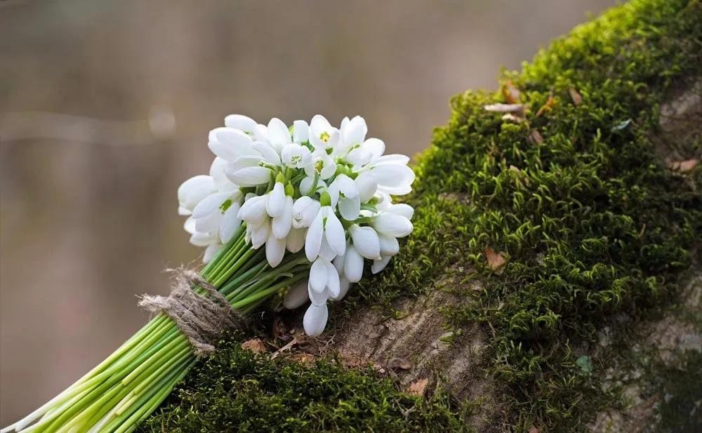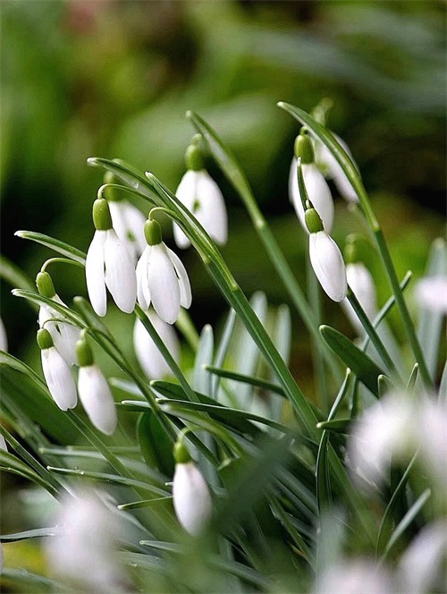 白色的雪滴花开起来就像是一个个下垂的小风铃一样。白色的小花倒挂在枝条上,淡雅清新~
