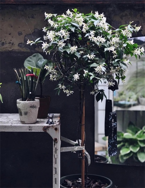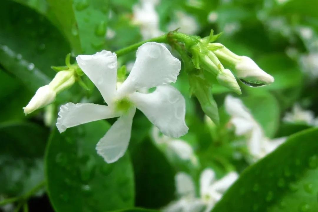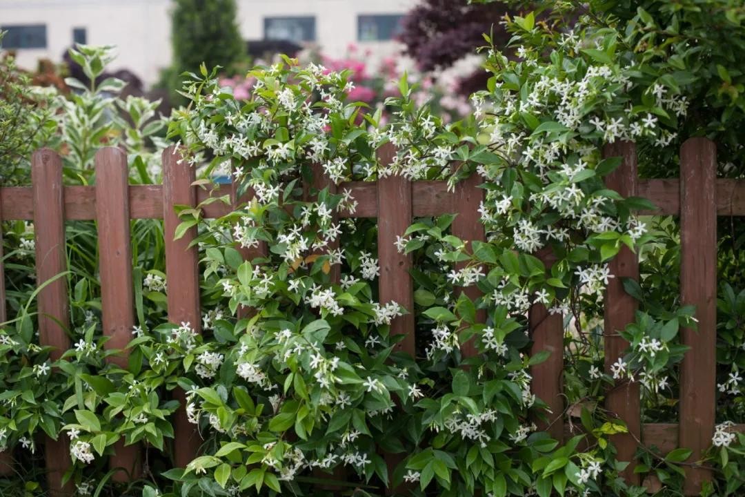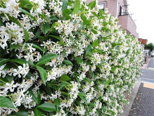 风车茉莉学名络石藤,因花似风车香若茉莉而有了这个别称,它是园艺届最重要的花墙植物之一,受欢迎程度非同一般。春夏交替之际是它的花期,每一节成熟枝条都会长出一串花蕾,在盛花时植株上会缀满了成千上万花,花量颇为壮观。