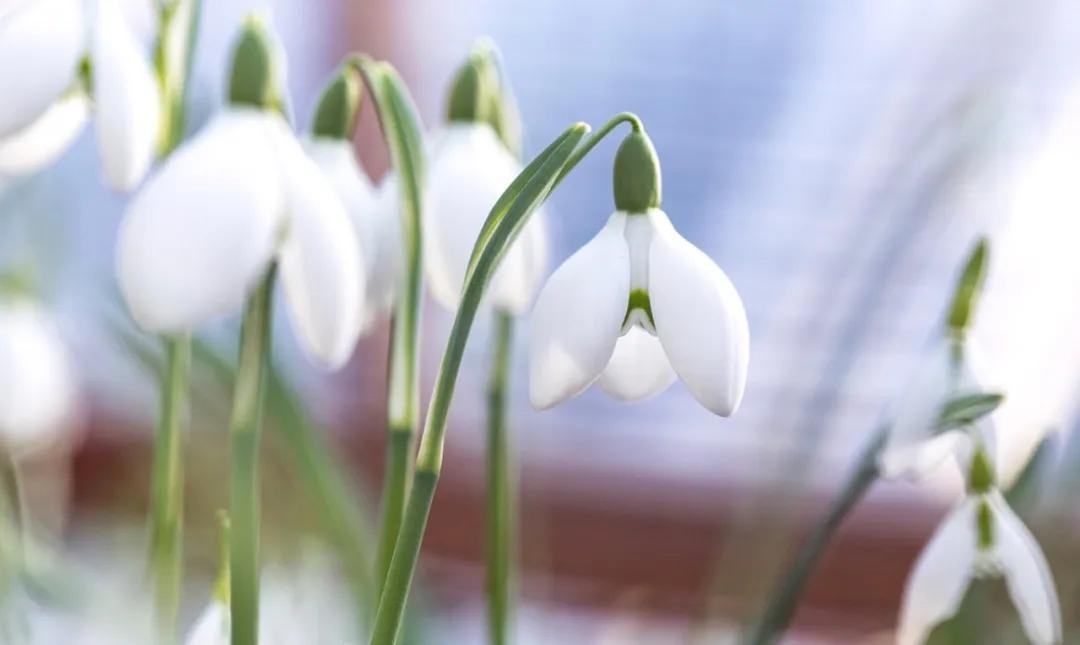 雪滴花,石蒜科球根花卉,植株矮小且呈丛生长,叶片细长油绿犹如韭菜,花开洁白如雪,花朵还很像个小铃铛。雪滴花在每年早春开放,甚至顶着雪都能绽放,算是比较早开放的球根花卉,而且它还比较耐寒,一般在零下15度的环境下,都能够在户外安全过冬,所以冬季不是特别寒冷的地区,秋季便可将其种植在庭院中。