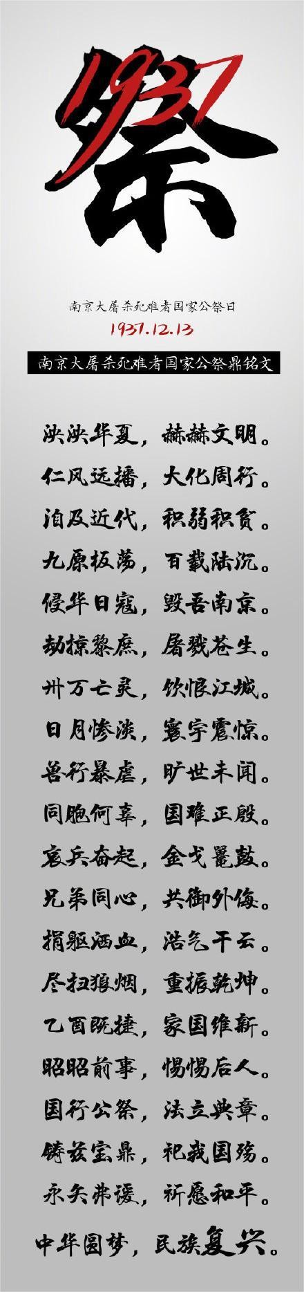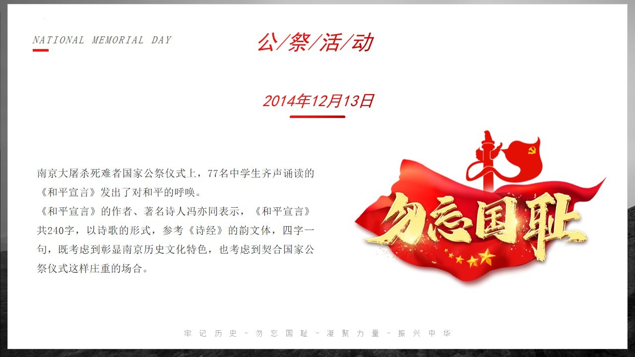 二零一四,国家公祭,中外人士,齐聚广场。白花致哀,庄严肃穆,丹忱抒写,和平诗章。