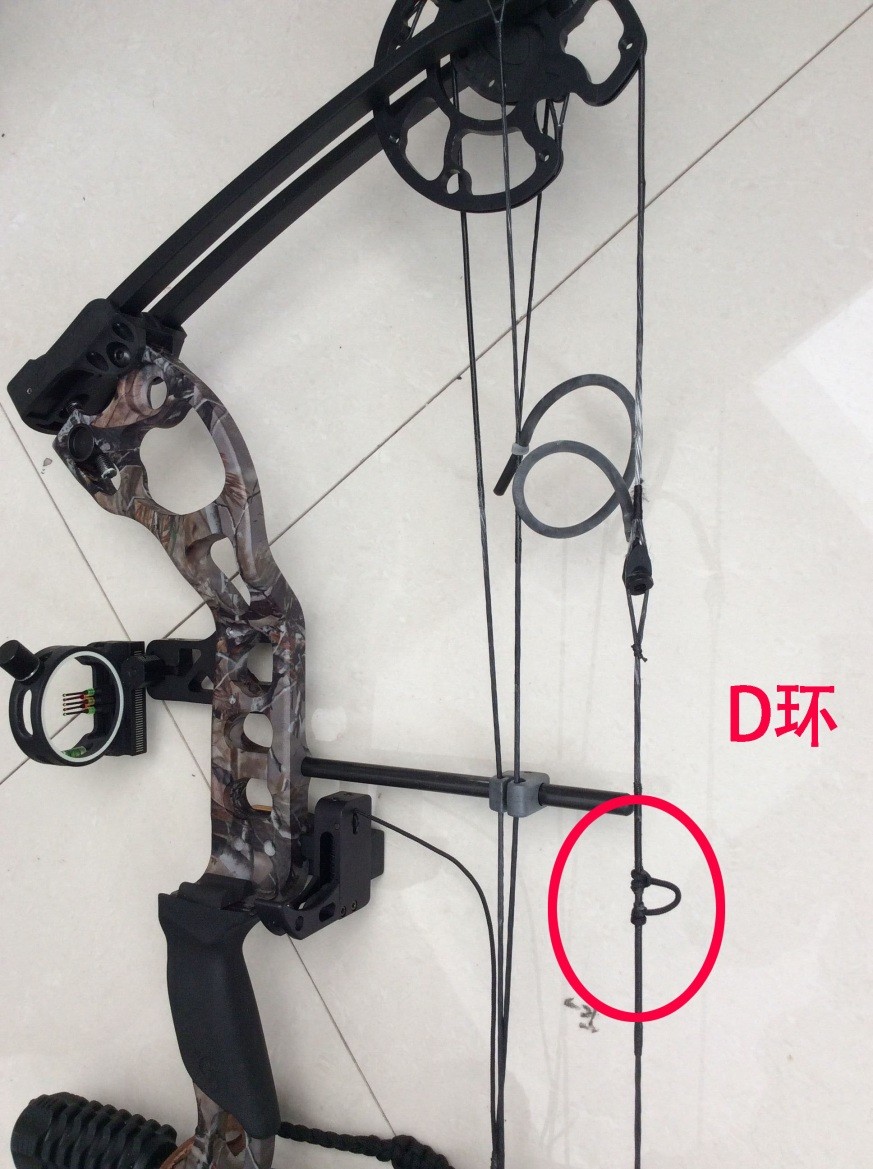 D环是安装在弓弦上的一个D型的绳环,它的存在方便了撒放器的使用,也减少了撒放器对于弓弦的伤害。D环一般使用特种的尼龙绳来制作,同时在绑扎方法上也有特殊的讲究。