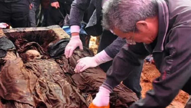 打开棺盖的那一刻,所有人都惊呆了。棺内躺着一具保存完好的男性尸体,通体呈红褐色,肌肤富有弹性。